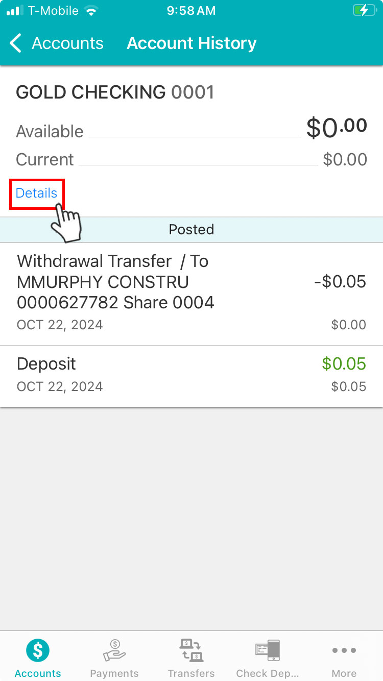 2: Select "Account Details.![]() | Step 3: When the account details are displayed, locate the routing number as the second item listed and account number as the third item listed.![]() |